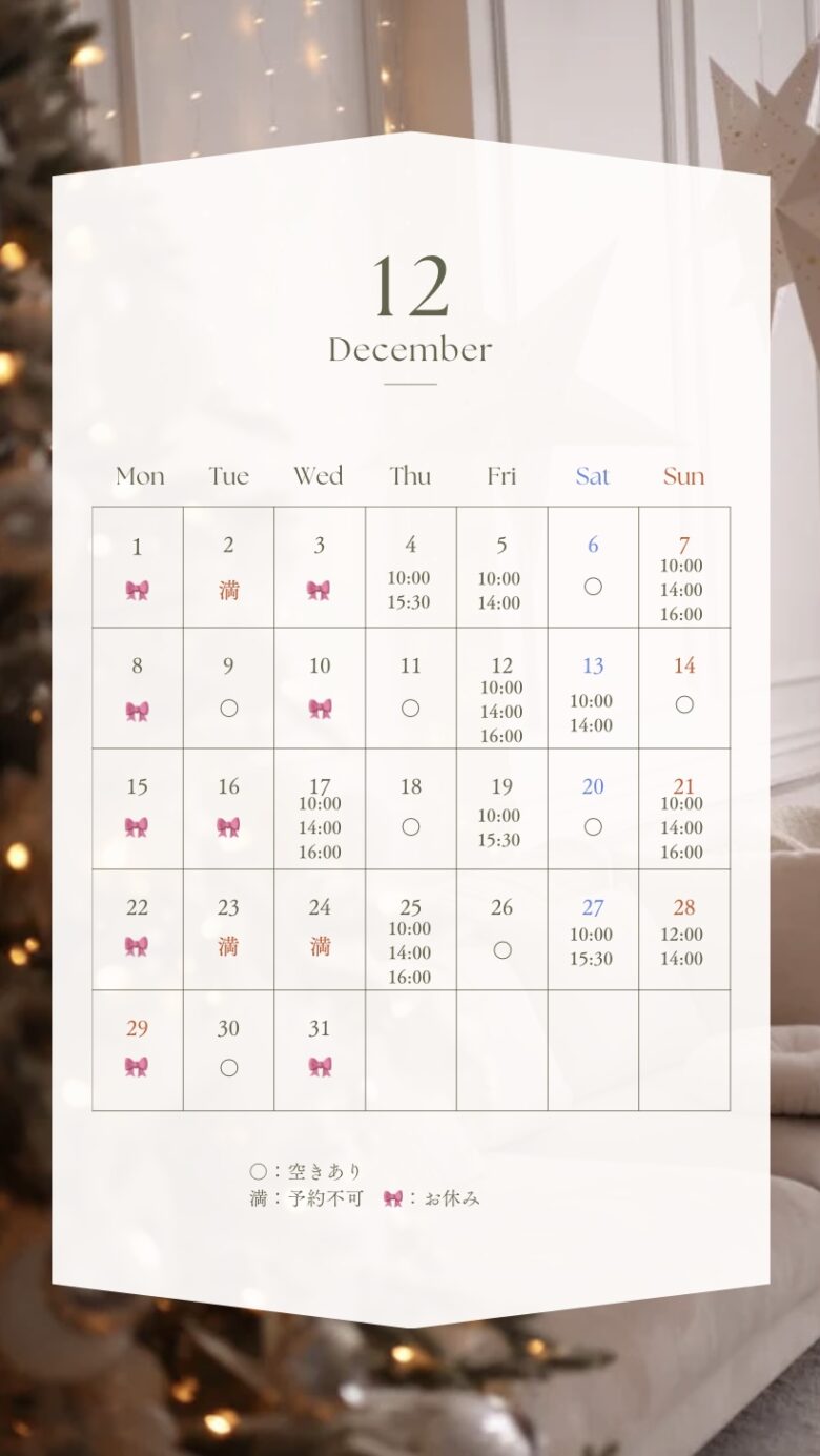 12月の営業スケジュール&空き状況 2025.11.27 Post Share Hatena Pocket RSS feedly Pin it 《残りわずか》11月ご案内可能な日程✨ 《年末年始の営業のお知らせ》